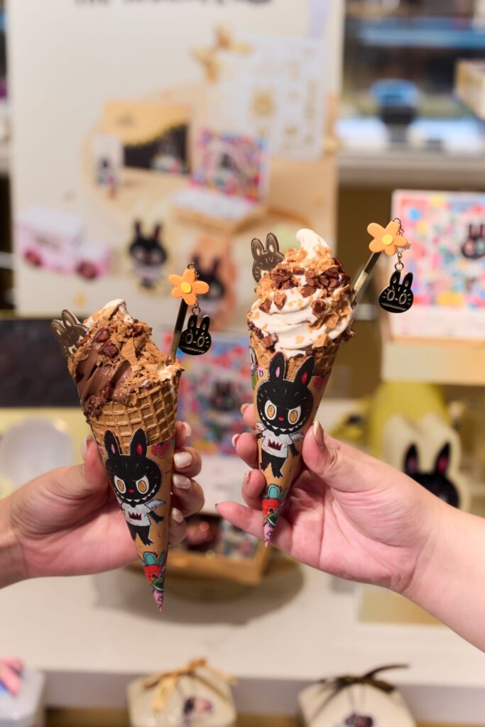 GODIVA x LABUBU黑巧克力味軟雪糕口感柔滑的黑巧克力散發濃郁的可可甘香,頂層鋪滿鬆脆的碧根果碎與可可薄脆,營造專屬秋季的浪漫氛圍。GODIVA x LABUBU榛子雙重巧克力味軟雪糕經典黑巧克力味和榛子巧克力味軟雪糕的幼滑互相交融。GODIVA x LABUBU榛子巧克力味軟雪糕溫潤綿密的榛子醬與香濃軟滑的巧克力完美交織,入口體驗多重享受。