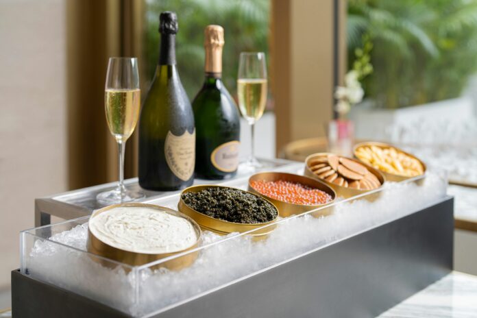 挑選任飲香檳的賓客更可獨家品嚐歡迎魚子醬體驗,無限量細味咀嚼以小班戟及鮮忌廉配搭的Amur魚子醬及三文魚子,為香檳錦上添花。