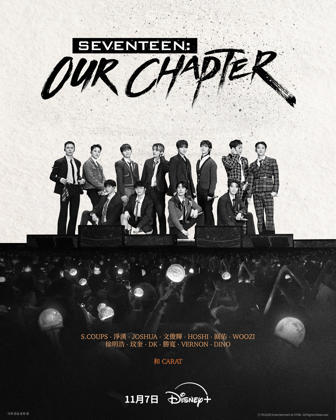 韓流男團SEVENTEEN上月在啟德舉行的香港演唱會,意猶未盡的粉絲可於即將推出的最新紀錄片看到他們舞台下的更多面貌!SEVENTEEN憑藉其長期稱霸流行榜的音樂和不容錯過的現場表演,於全球俘獲無數觀眾。而以他們為主角的全新四集音樂紀錄片《SEVENTEEN:OUR CHAPTER》,將於11月7日Disney+ 獨家上線。
