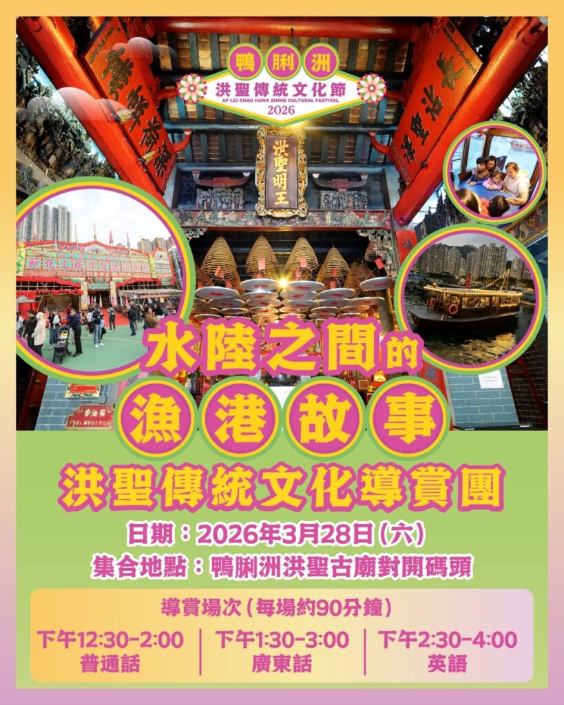 鴨脷洲的年度盛事「洪聖傳統文化節」是南區一個極富地方特色信仰的大型傳統文化活動。2026年鴨脷洲洪聖傳統文化節將於2026年3月28日(星期六) 特設3場洪聖傳統文化導賞團活動,邀請公眾乘觀光船遊覽香港仔避風塘丶參觀歷史悠久的洪聖古廟丶遊走大戲棚認識粵劇文化了解洪聖誕的由來及文化意義。