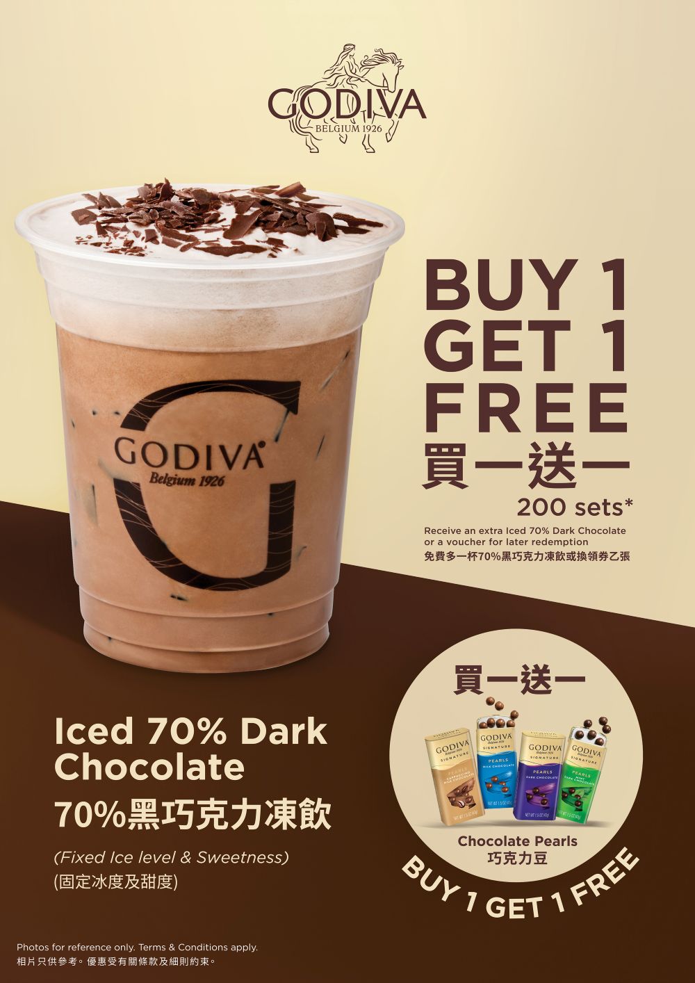 優惠期間,於香港GODIVA專門店(新都會廣場店及期間限定店除外)購買70%黑巧克力凍飲,即可享買一送一優惠!所贈送的凍飲可即時享用,或選擇以換領券形式領取,讓你隨時隨地品嚐濃郁巧克力的幸福滋味。