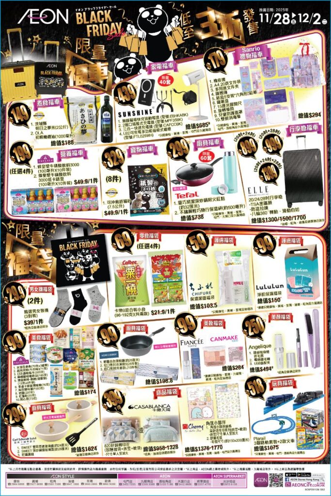 推廣活動包括: 超值限量AEON Black Friday福袋及福車;更有「限量免費換領Black Friday精美文件夾」、「$28限量換購DAISO摺疊式購物車」、「會員$50現金賞大放送」、「只限2天 限時放題」等推廣活動 ; 而且多款精選商品亦以低至半價發售,貨品涵蓋食品、煮食用具、寵物用品、床品等,供顧客選購,快來AEON購物啦!