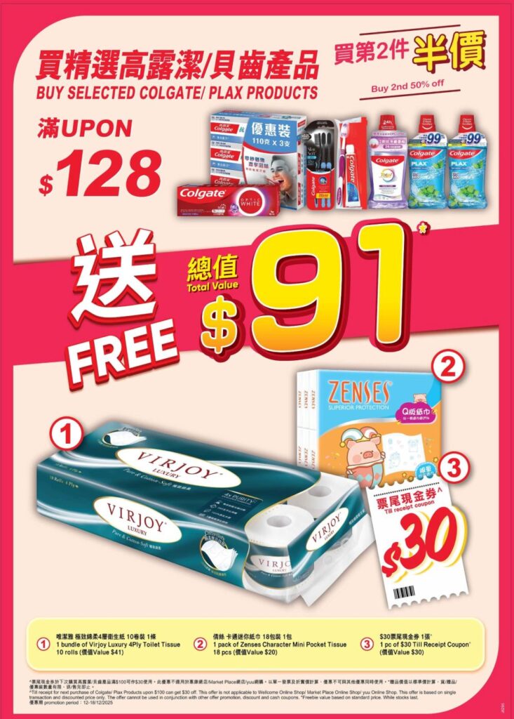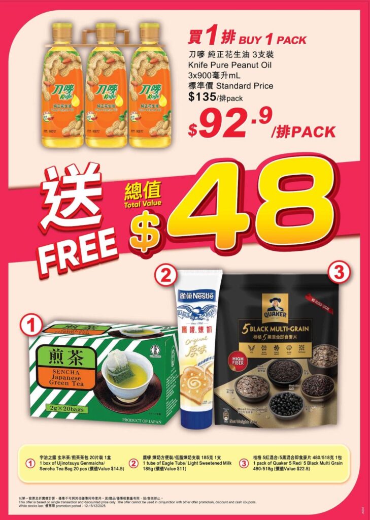 再加推一系列激抵優惠,由12月12日至18日購買,購買1排刀嘜純正花生油3支裝,即送總值$48的豐富禮品;購買6盒史雲生清雞湯(澳洲) 1公斤,即送總值$34的豐富禮品;購買2件精選高露潔/貝齒產品,第2件即享半價優惠;滿$128即送總值$91豐富禮品,齊來以最優惠價錢入手心水產品!