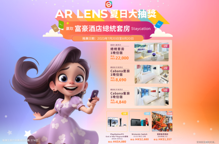 2023年7月20日至8月20日期間下載AR Lens手機應用程式,登記成為用戶並使用擴增實境(AR)捕捉屏幕上懸浮富豪酒店房卡的圖案,即可參加抽獎, 有機會贏取富豪酒店的豐富獎品! 獎品包括富豪九龍酒店總統套房1晚住宿(價值港幣22,000元) ,麗豪航天城酒店Cabana套房1晚住宿(價值港幣8,690元) 以及自助餐等禮遇。仲有 PS5, Switch等獎品總值超過港幣100萬元! 無需任何消費, 即玩即抽即中獎, 每日一次!